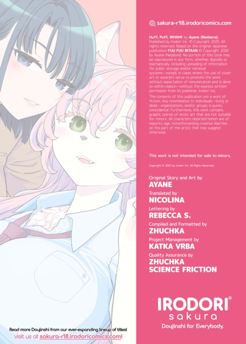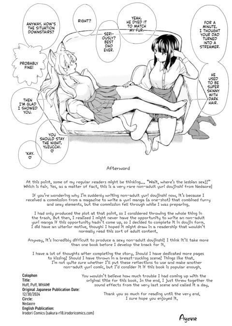 | Description | When Hotaru contracted Zoomorphic Syndrome (the "Zoomies" for short) at a young age, she became a little more animal each day. After hearing a rumor that “Love cures the Zoomies,” she impulsively plants a kiss on her best friend, Yuzu, which sadly spells the end for their childhood friendship.Years later, fate reunites Hotaru and Yuzu, but Yuzu doesn't recognize the fully Zoomorphized Hotaru! (Or does she...?) Either way, Hotaru is determined not to let this second chance slip away. Yuzu's gonna be her friend whether she likes it or not—and maybe even her girlfriend!This rated-R one-shot from Ayane is equal parts raunchy and raucous! (Although this book contains no actual sexual content, it is certainly not safe for work!) |