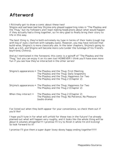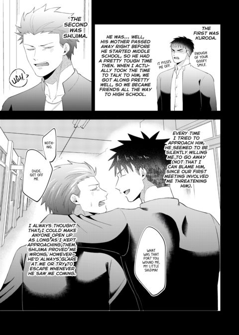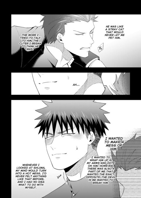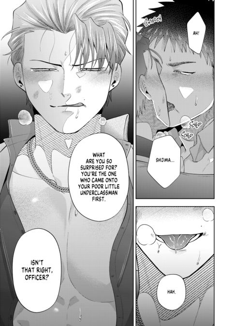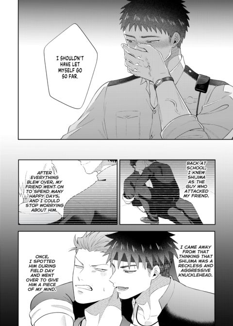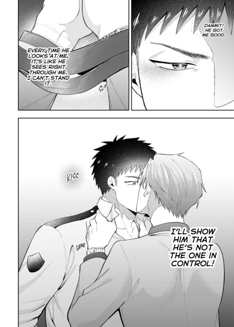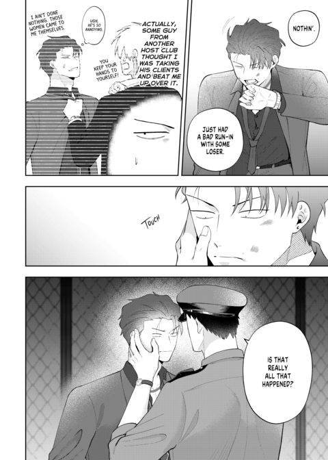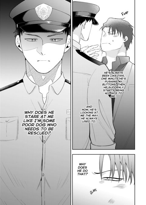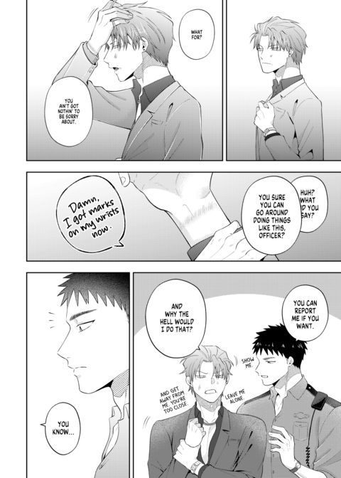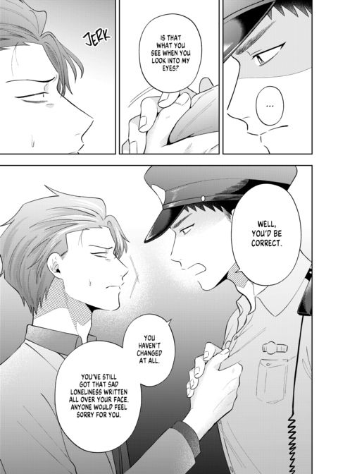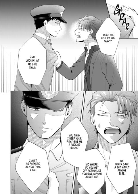 | Description | Shijima's had a rough night, and the last thing he wants is for someone to see him in his sorry state. Fate seems to have other ideas, though, when a policeman finds him in a dumpster. This policeman isn't just anyone, however—it's Shigino, the upperclassman that wouldn't leave him alone in high school. Angered by what seems to be Shigino's pity, Shijima lashes out at him. Will this be fuel on their long-smoldering fire, or will genuine sparks fly? |