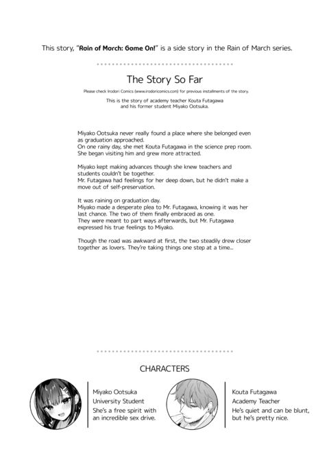 (This is a side story in the Rain of March series) Mr. Futagawa bought a popular game and Miyako decides to challenge him to a match. To make things more interesting, they put a little wager on the results. The loser has to do whatever the winner says! Who will win and just what will they ask the other to do? |