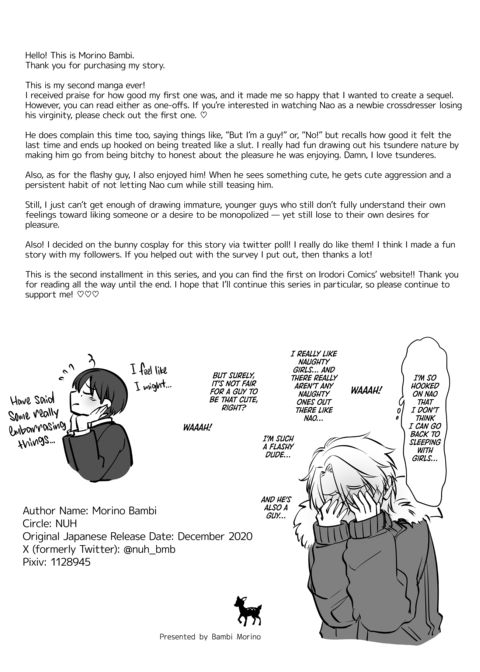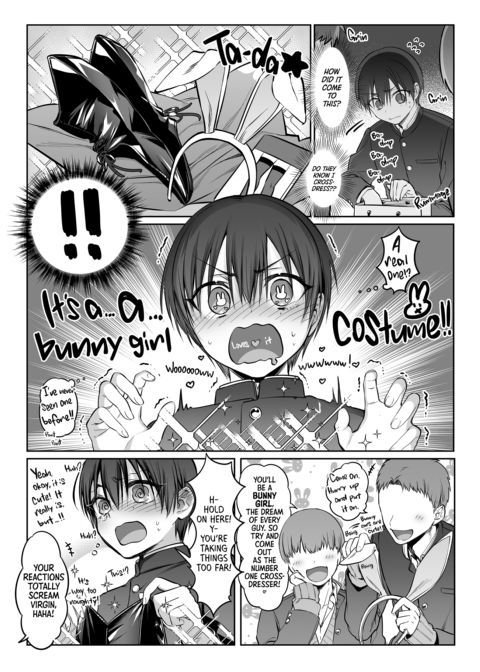 | Description | After being basically forced to join the school’s crossdressing contest, Nao has to dress up as a bunny girl… Which he’s sort of not on board with, or is he? After chatting with the guy from last time, they meet up and he suggests that they hook up with Nao in the costume so that he can get used to it… |
