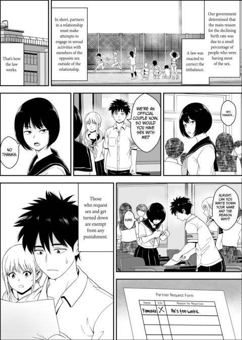 | Description | After civilization nearly collapsed due to a declining birthrate, the government enacted a new law. The Equal Sexual Opportunity Act helps ensure that it’s not simply a select few getting together to have sex. Partners in a declared relationship must ask others outside the relationship for sex. Can real love stand the test of such an ordeal? |